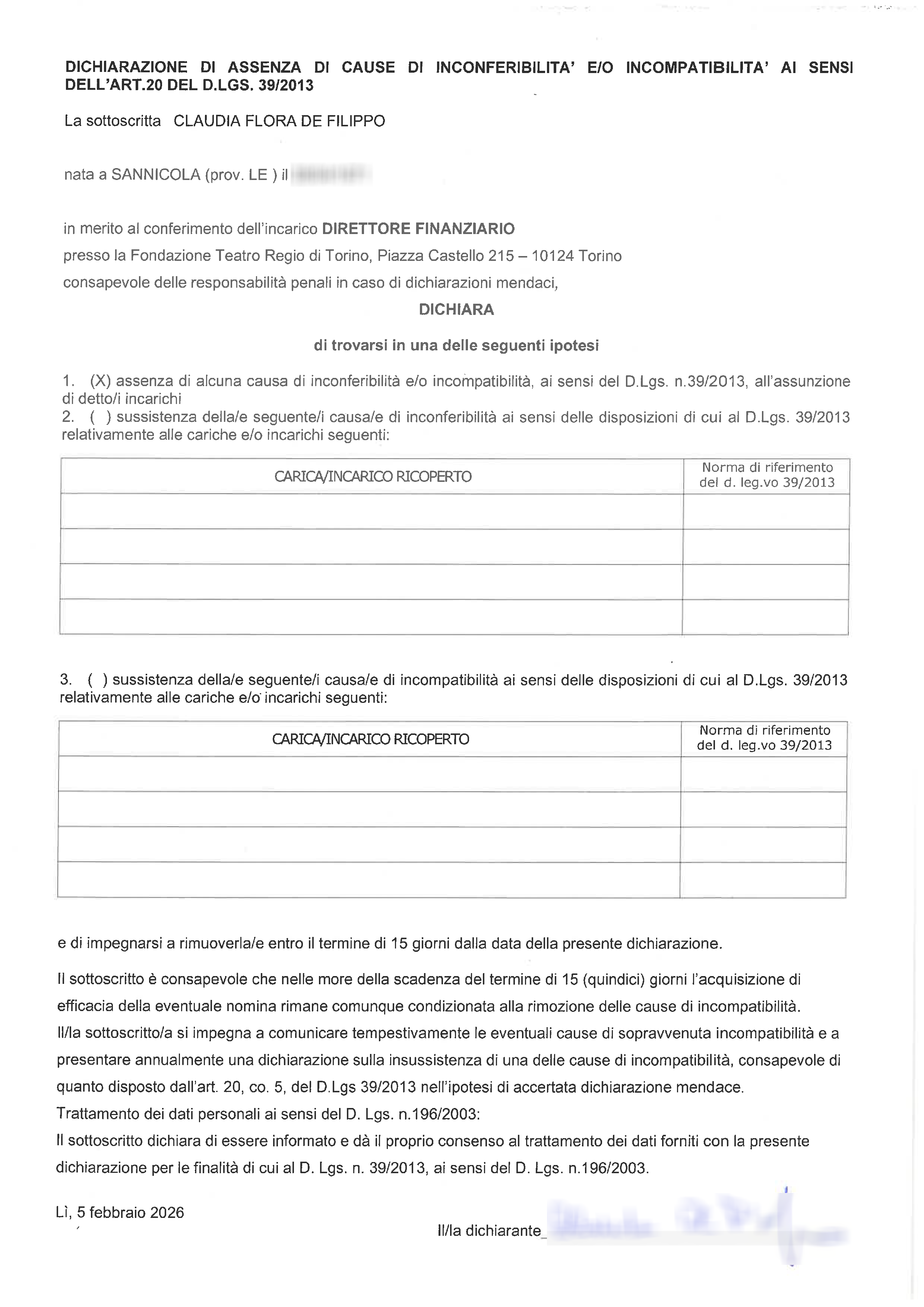Curriculum vitae, Dichiarazione altre cariche, Dichiarazione ai sensi D.Lgs. 39-2013 - Claudia De Filippo - Direzione finanziaria